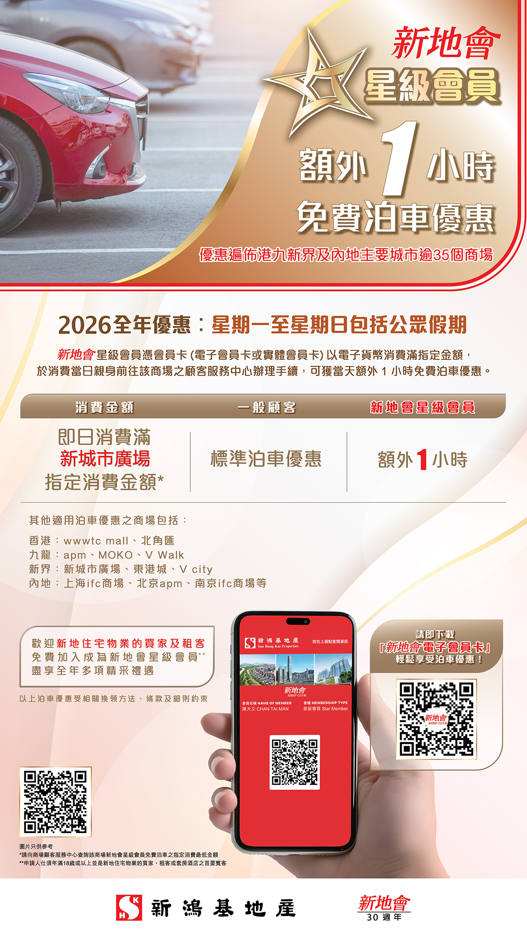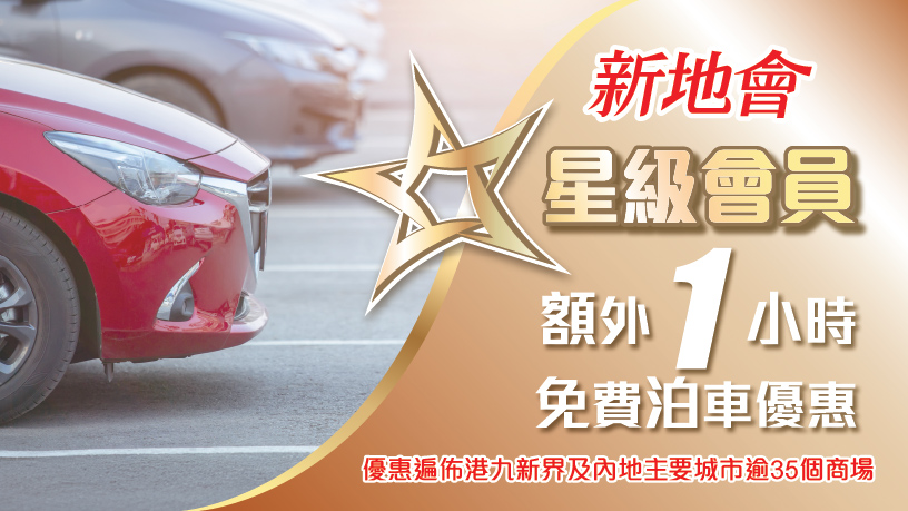 From Monday to Sunday including public holidays, SHKP Club Star members can enjoy an extra hour of free parking at New Town Plaza with Star membership cards (eMembership Card or Physical Membership Card).